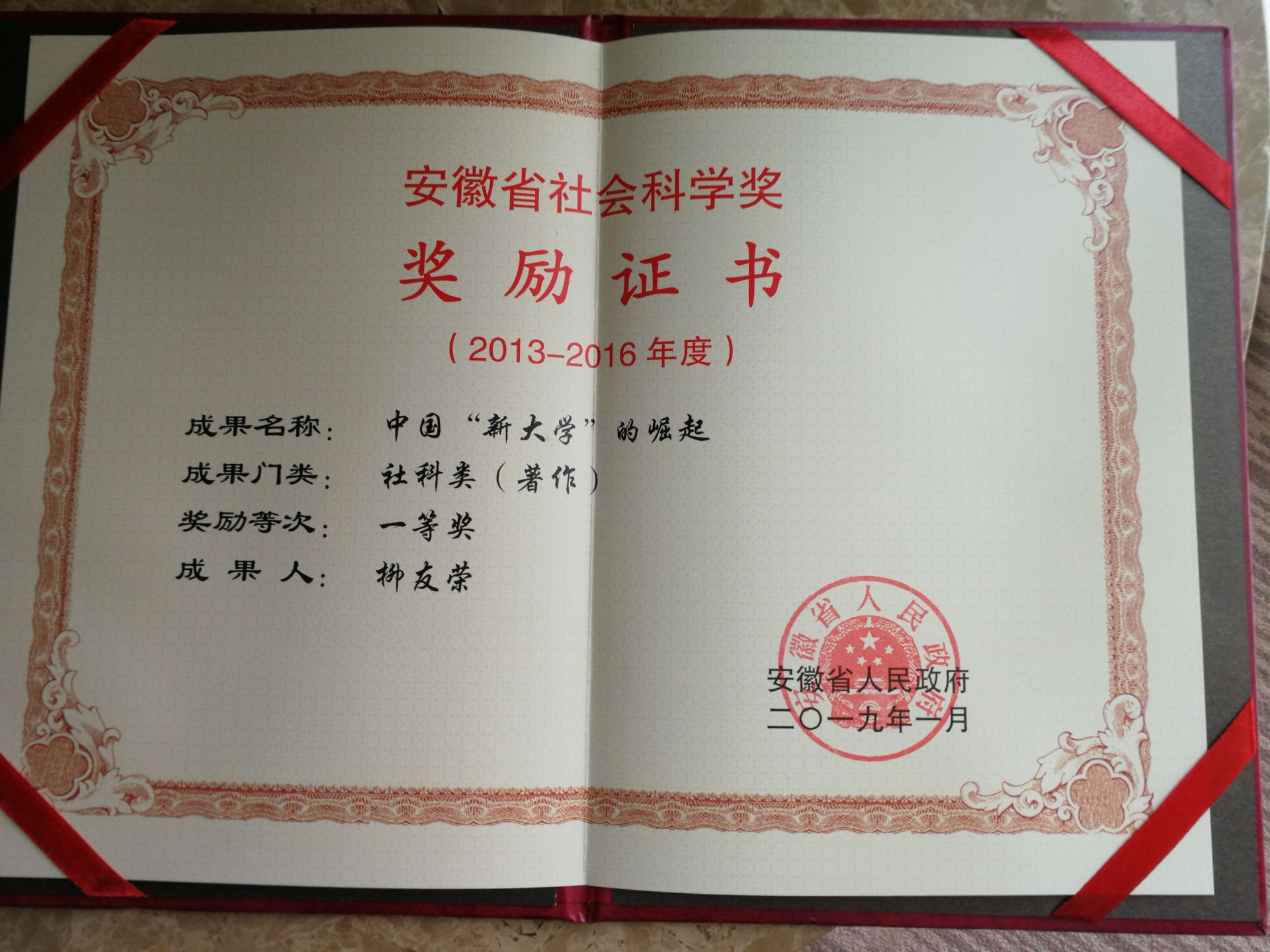 我校柳友荣教授长期致力于新时代中国特色现代大学制度的学理阐释与实践,2016年度撰写的专著《中国“新”大学的崛起》荣获安徽省社会科学奖一等奖,这是我校首次获得此类最高奖项。