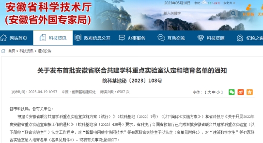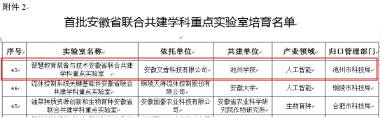 近日,安徽省科学技术厅发布了《关于发布首批安徽省联合共建学科重点实验室认定和培育名单的通知》,我校与安徽文香科技有限公司共建的“智慧教育装备与技术”安徽省联合共建学科重点实验室成功入选培育名单。