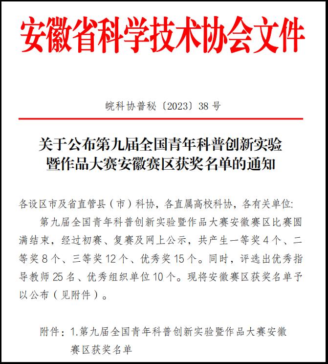 5月28日,由安徽省科协主办、安徽省科技馆承办的第九届全国青年科普创新实验暨作品大赛安徽赛区复赛在省科技馆落下帷幕,我校参赛作品“小智到家”(微信小程序)荣获智慧社区大学组三等奖(学生:王乐婷、祖胜玲、彭景;指导教师:朱昭阳)。我校科协获得第九届全国青年科普创新实验暨作品大赛安徽赛区优秀组织奖。
